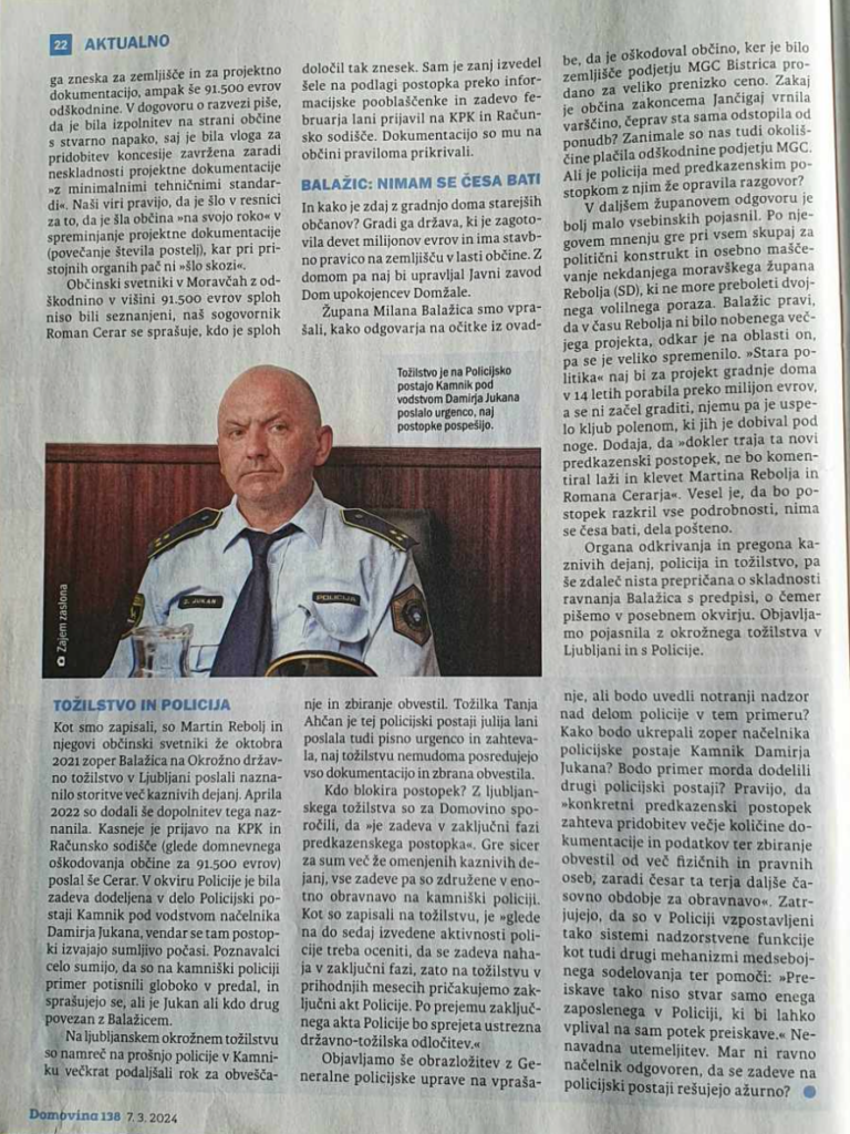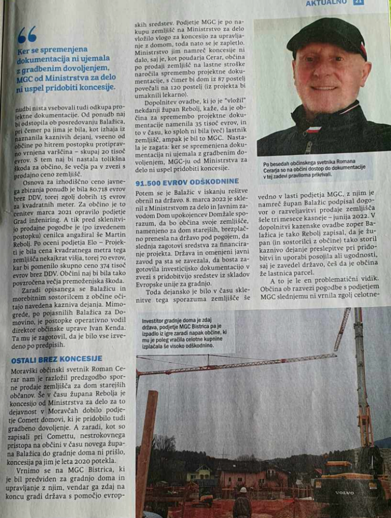 Članek objavljen v tedniku DOMOVINA ima 3 strani zanimivega branja o poslih župana Moravč Milana Balažica. Precej natančno opisano kako neodgovorno je potekalo MEŠETARJENJE župana Milana Balažica, ki se sedaj sklicuje na direktorja Občinske uprave Ivana Kendo. Če seštejemo 91.500 EUR plus 35.000 EUR in še stroške odvetnikov in notarja, se nabere kar lep znesek. Pogodbe je podpisoval, župan občine Moravče MILAN BALAŽIC.
